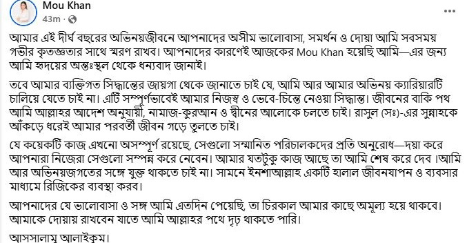 শুক্রবার দেওয়া পোস্টে মৌ লেখেন, জীবনের বাকি পথ আমি আল্লাহর আদেশ অনুযায়ী, নামাজ-কুরআন ও দ্বীনের আলোকে চলতে চাই। রাসুল (সঃ)-এর সুন্নাহকে আঁকড়ে ধরেই আমার পরবর্তী জীবন গড়ে তুলতে চাই।