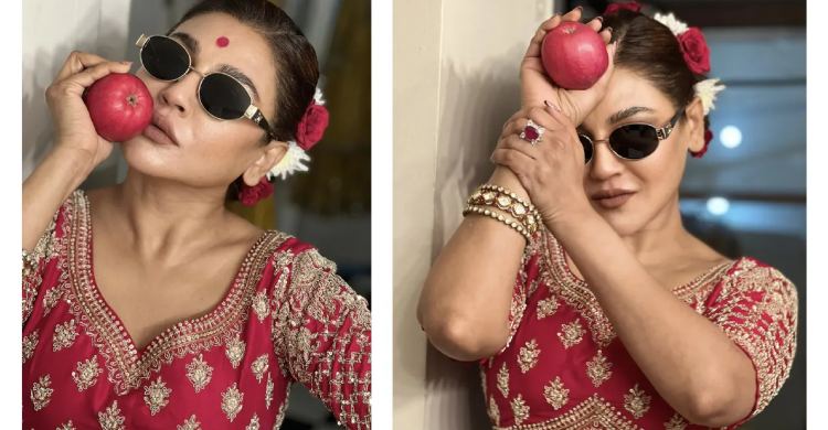 তবে এই পুরো সাজের সবচেয়ে বড় চমক ছিল তার হাতে থাকা একটি টুকটুকে লাল আপেল। নায়িকা সেই আপেল নিয়ে নানা ভঙ্গিতে পোজ দিয়েছেন—কখনো আপেল হাতে ধরে, আবার কখনো মাথায় ব্যালেন্স করে, এমনকি কখনো ঠোঁটের কাছে ঠেকিয়ে ছবি তুলেছেন।