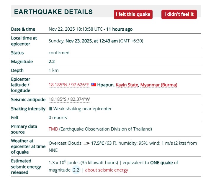 মাত্রা কম হলেও শঙ্কার বিষয়টি হল ভূমিকম্পটির উৎসস্থল ছিল মাটির মাত্র ১ কিলোমিটার গভীরে; ১৮.১৮৫°উত্তর অক্ষাংশ ও ৯৭.৬২৬°পূর্ব দ্রাঘিমাংশে।