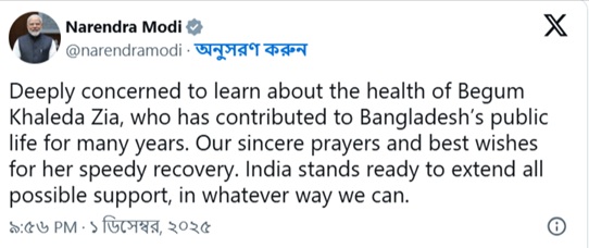সাবেক প্রধানমন্ত্রী ও বিএনপি চেয়ারপারসন বেগম খালেদা জিয়ার সুস্থতা কামনা করে সামাজিক যোগাযোগ মাধ্যমে একটি পোস্ট করেছেন ভারতের প্রধানমন্ত্রী নরেন্দ্র মোদি। পাশাপাশি বাংলাদেশি নেত্রীর চিকিৎসার যেকোনো প্রয়োজনে ভারত সহায়তা করতে প্রস্তুত বলেও জানিয়েছেন।