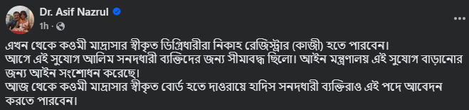 নিজের ভেরিফায়েড ফেসবুকে এই তথ্য জানিয়েছেন আইন উপদেষ্টা ড. আসিফ নজরুল।