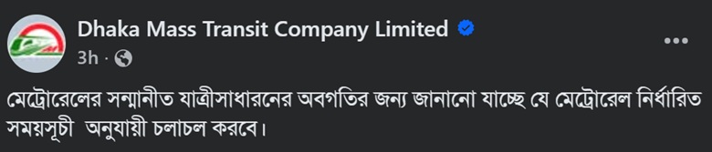 ওই পোস্টে বলা হয়, মেট্রোরেলের সম্মানিত যাত্রীসাধারণের অবগতির জন্য জানানো যাচ্ছে যে, মেট্রোরেল নির্ধারিত সময়সূচী অনুযায়ী চলাচল করবে।