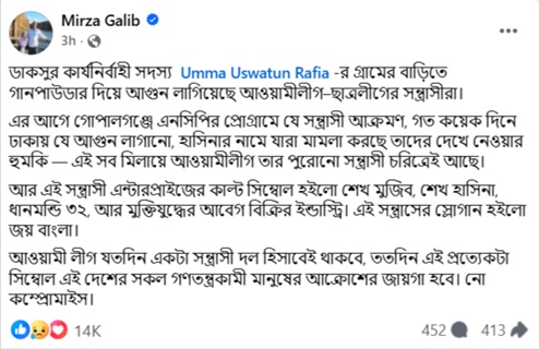 রাজধানীসহ দেশজুড়ে সাম্প্রতিক বাসে আগুনসহ জ্বালাও-পোড়াও ও ককটেল বিস্ফোরণের ঘটনা প্রবাহের প্রসঙ্গ টেনে মির্যা গালিব বলেন, ডাকসুর কার্যনির্বাহী সদস্য উম্মে উসওয়াতুন রাফিয়ার গ্রামের বাড়িতে গানপাউডার দিয়ে আগুন লাগিয়েছে আওয়ামী লীগ–ছাত্রলীগের সন্ত্রাসীরা।