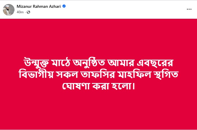 পোস্টে তিনি লিখেন, ‘উন্মুক্ত মাঠে অনুষ্ঠিত আমার এবছরের বিভাগীয় সকল তাফসির মাহফিল স্থগিত ঘোষণা করা হলো।’