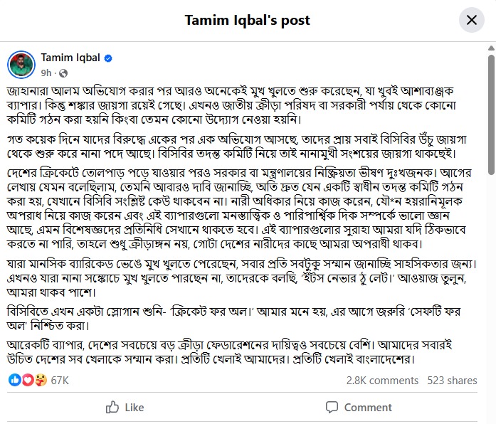 ফেসবুকে নিজের ফেরিফাইড পেজে তামিম লেখেন, ‘জাহানারা আলম অভিযোগ করার পর আরও অনেকেই মুখ খুলতে শুরু করেছেন, যা খুবই আশাব্যঞ্জক ব্যাপার। কিন্তু শঙ্কার জায়গা রয়েই গেছে। এখনও জাতীয় ক্রীড়া পরিষদ বা সরকারী পর্যায় থেকে কোনো কমিটি গঠন করা হয়নি কিংবা তেমন কোনো উদ্যোগ নেওয়া হয়নি।’