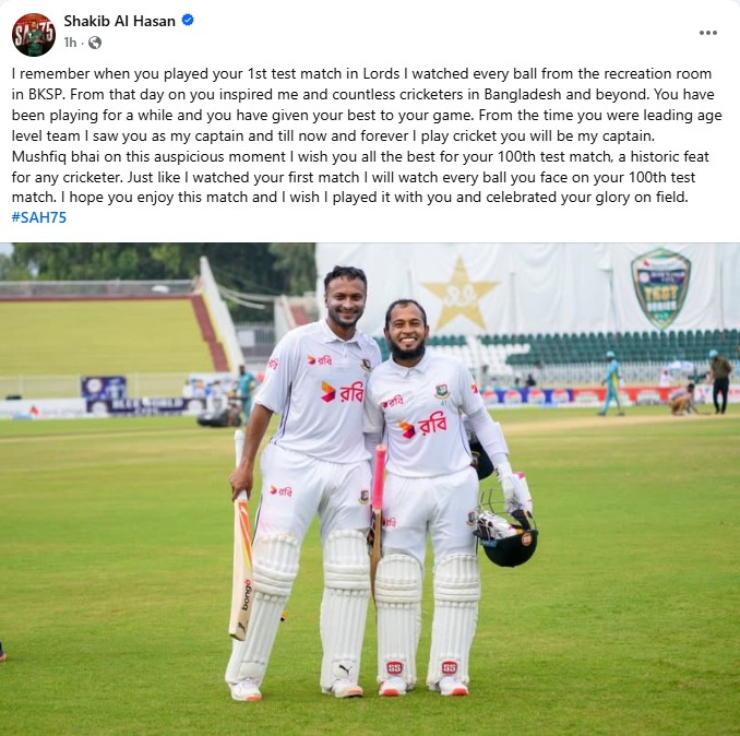 মুশফিকের সাফল্যের এই বিশেষ দিনে সাকিবের বার্তা আবারও মনে করিয়ে দিল, বাংলাদেশের ক্রিকেটে তাদের পারস্পরিক শ্রদ্ধা আর বন্ধন এখনো অটুট।
